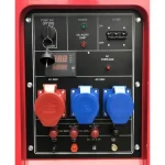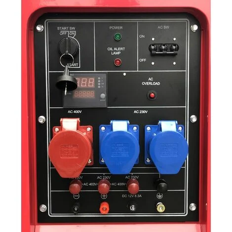 Caractéristiques : Boîtier insonoriséentièrement recouvert de mousse insonorisante Prises de courant : 3 x 400 V 32 A (1x) et prise industrielle bleue 230 V 32 A (2x) Puissance maximale de 15,0 kW sur 3 x 400 V Puissance maximale de 5,0 kW sur 1 x 230 V Démarrage électrique Moteur diesel 20,4 ch refroidi par air Réglage de la tension AVR: fournit une tension de sortie stable de 230 V.